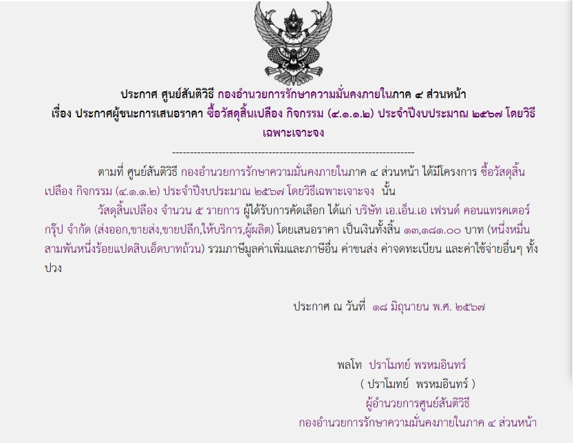 ประกาศผู้ชนะการเสนอราคา ซื้อวัสดุสิ้นเปลือง กิจกรรม (๔..๑.๑.๒) ประจำปีงบประมาณ ๒๕๖๗ โดยวิธี เฉพาะเจาะจง