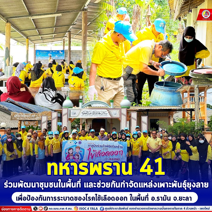 วันที่ 12 กรกฎาคม 2567 เวลา 09.00 น. หน่วยเฉพาะกิจกรมทหารพรานที่ 41 จัดกำลังพล ชุดปฏิบัติการกิจการพลเรือน กองร้อยทหารพรานที่ 4112 ร่วมกับ อบต.กาลูปัง, ปลัดอำเภอ, ส่วนราชการ, ผู้นำท้องถิ่น, ผู้นำศาสนา, รพ.สต., อสม., และประชาชนจิตอาสาในพื้นที่ ร่วมกิจกรรมจิตอาสา “เราทำความดี ด้วยหัวใจ” พัฒนาและปรับปรุงภูมิทัศน์ ให้มีความเป็นระเบียบ เรียบร้อย และสวยงาม และกิจกรรมรณรงค์ควบคุมลูกน้ำ คว่ำภาชนะที่มีน้ำขัง เพื่อกำจัดแหล่งเพาะพันธุ์ลูกน้ำยุงลาย และเป็นการป้องกันโรคไข้เลือดออก ในพื้นที่ บ้านเลสุ หมู่ที่ 4 ตำบลกาลูปัง อำเภอรามัน จังหวัดยะลา