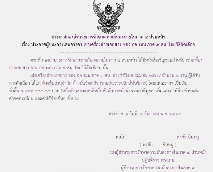 ประกาศผู้ชนะการเสนอราคา เช่าเครื่องถ่ายเอกสาร ของ กอ.รมน.ภาค 4 สน. โดยวิธีคัดเลือก ( 1,245,000.00 บาท )