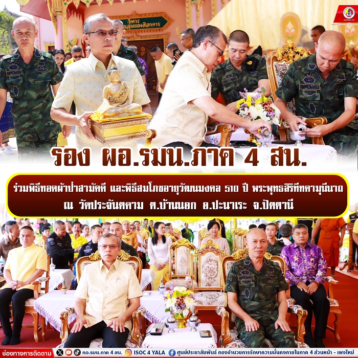 วันนี้ (14 กรกฎาคม 2567) เวลา 09.00 น. ที่ วัดประจันตคาม (วัดบ้านนอก) ตำบลบ้านนอก อำเภอปะนาเระ จังหวัดปัตตานี พลตรี กรกฎ ภู่โชติ รองผู้อำนวยการรักษาความมั่นคงภายในภาค 4 ส่วนหน้า ร่วมพิธีทอดผ้าป่าสามัคคี และพิธีสมโภชอายุวัฒนมงคล 510 ปี พระพุทธสิริทีฑคามุนีนาถ หรือพ่อท่านบ้านยาว พระคู่บ้านคู่ชุมชนตำบลบ้านนอก โดยมี พระเทพปริยัติคุณ ที่ปรึกษาเจ้าคณะภาค 18 / เจ้าอาวาสวัดคูหาสวรรค์ พระอารามหลวงจังหวัดพัทลุง เป็นประธานฝ่ายสงฆ์ และนายนันทพงศ์ สุวรรณรัตน์ รองเลขาธิการศูนย์อำนวยบริหารจังหวัดชายแดนภาคใต้ เป็นประธานฝ่ายฆราวาส พร้อมคณะผู้บังคับบัญชา, ทหาร, ตำรวจ, หัวหน้าส่วนราชการ และพุทธศาสนิกชน เข้าร่วมพิธีเป็นจำนวนมาก