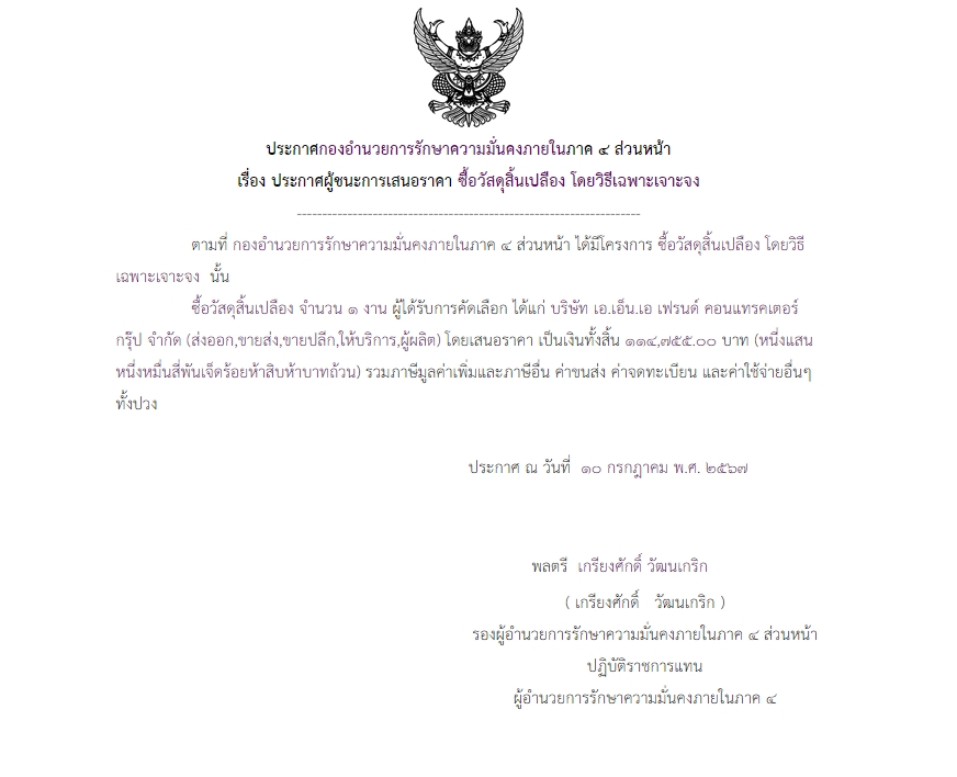 ประกาศผู้ชนะการเสนอราคา ซื้อวัสดุสิ้นเปลือง โดยวิธีเฉพาะเจาะจง