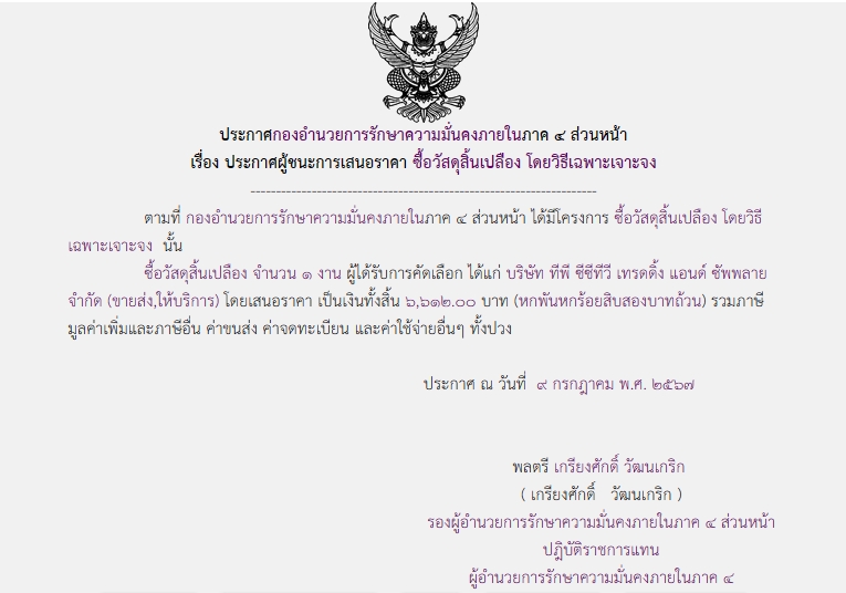 ประกาศผู้ชนะการเสนอราคา ซื้อวัสดุสิ้นเปลือง โดยวิธีเฉพาะเจาะจง