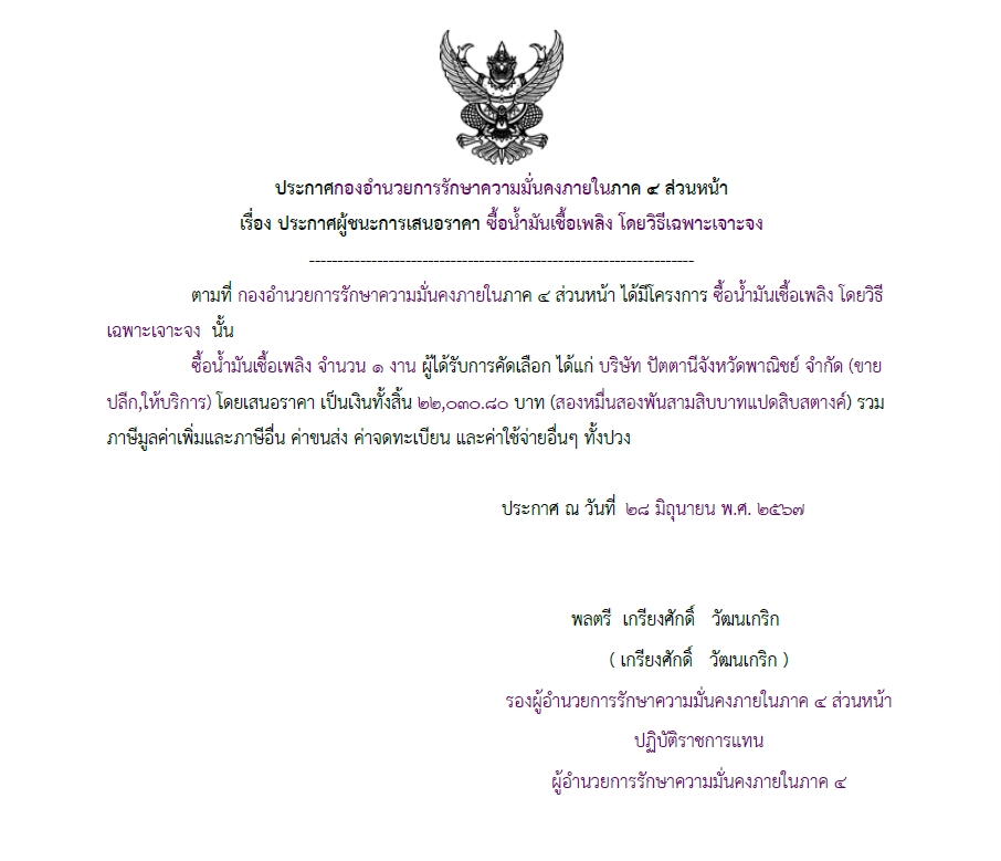 ประกาศผู้ชนะการเสนอราคา ซื้อน้ำมันเชื้อเพลิง โดยวิธีเฉพาะเจาะจง