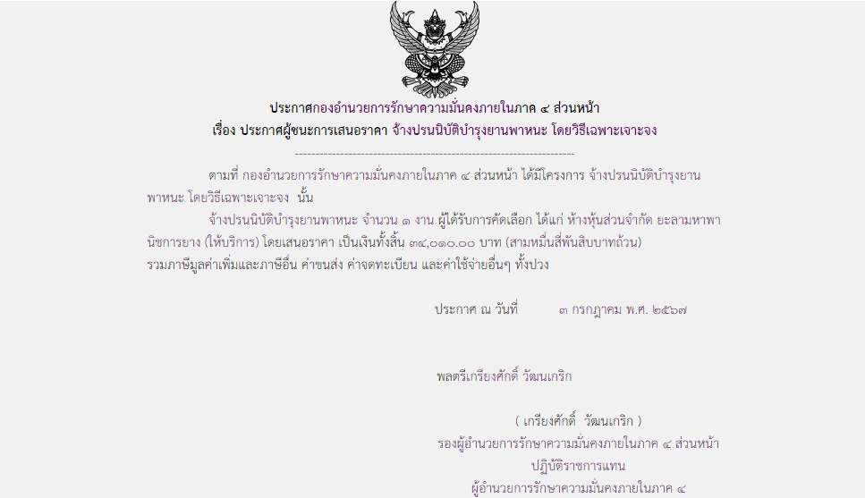 ประกาศผู้ชนะการเสนอราคา จ้างปรนนิบัติบำรุงยานพาหนะ โดยวิธีเฉพาะเจาะจง