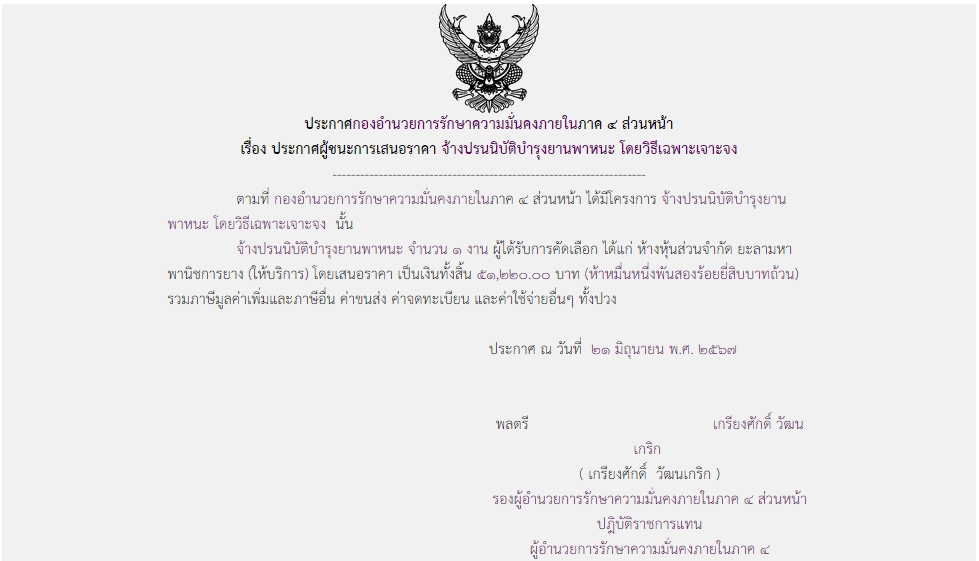 ประกาศผู้ชนะการเสนอราคา จ้างปรนนิบัติบำรุงยานพาหนะ โดยวิธีเฉพาะเจาะจง