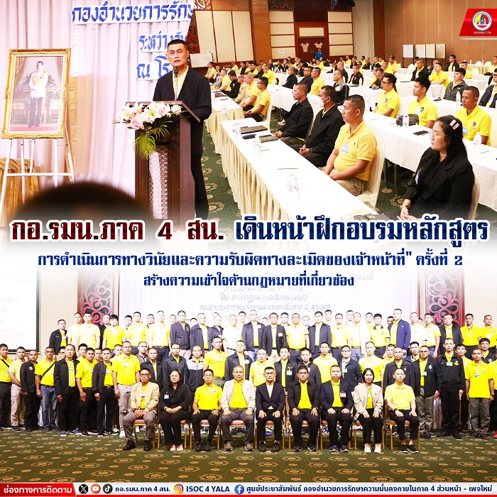 วันนี้ 16 กรกฎาคม 2567 เวลา 09.00 น. ณ โรงแรมบีพี สมิหลาบีช รีสอร์ท อำเภอเมืองสงขลา จังหวัดสงขลา พันเอก อัทฒเศรษฐ์ เต็มมีศรี รองเลขาธิการ กองอำนวยการรักษาความมั่นคงภายในภาค 4 ส่วนหน้า เป็นประธานพิธีเปิดการฝึกอบรมหลักสูตร “การดําเนินการทางวินัยและความรับผิดทางละเมิดของเจ้าหน้าที่” ประจำปีงบประมาณ 2567 ครั้งที่ 2 โดยมี พันเอก เฉลิมชัย สุทธินวล รองผู้อำนวยการสำนักกฎหมายและสิทธิมนุษยชน กองอำนวยการรักษาความมั่นคงภายในภาค 4 ส่วนหน้า, พันตำรวจเอก จารุวิทย์ วงศ์ชัยกิตติพร รองผู้อำนวยการสำนักกฎหมายและสิทธิมนุษยชน กองอำนวยการรักษาความมั่นคงภายในภาค 4 ส่วนหน้า และเจ้าหน้าที่ทหาร ตำรวจที่ปฏิบัติงานในพื้นที่จังหวัดชายแดนภาคใต้ จํานวน 136 นาย เข้าร่วมอบรมฯ