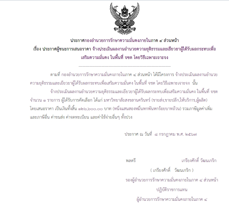 จัดซื้อ จัดจ้างประกาศผู้ชนะการเสนอราคา ประกาศผู้ชนะการเสนอราคา จ้างประเมินผลงานอำนวยความยุติธรรมและเยียวยาผู้ได้รับผลกระทบเพื่อเสริมความมั่นคง ในพื้นที่ จชต โดยวิธีเฉพาะเจาะจง July 17, 2024 340 Share Facebook Twitter Google+ Telegram LINE