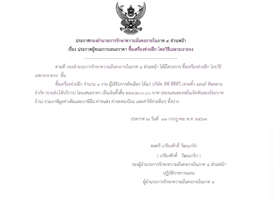 ประกาศผู้ชนะการเสนอราคา ซื้อเครื่องช่วยฝึก โดยวิธีเฉพาะเจาะจง