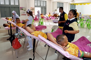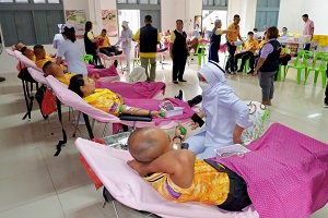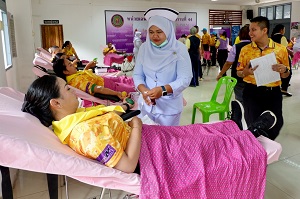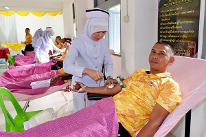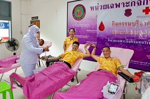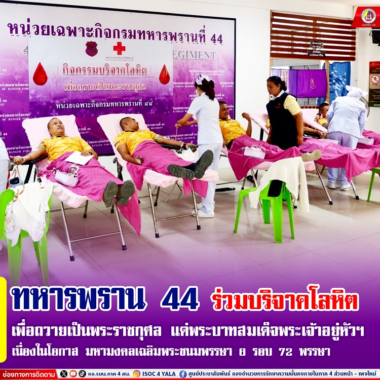 เมื่อวันที่ 16 กรกฎา 2567 เวลา 09.30 น. พันเอก ภาคภูมิ จันทรักษ์ ผู้บังคับหน่วยเฉพาะกิจกรมทหารพรานที่ 44 พร้อมกับกำลังพลของหน่วย ร่วมบริจาคโลหิต “เพื่อถวายเป็นพระราชกุศล เเด่พระบาทสมเด็จพระเจ้าอยู่หัวฯ เนื่องในโอกาสมหามงคล เฉลิมพระชนมพรรษา 6 รอบ 72 พรรษา ใน 28 กรกฎาคม 2567” โดย สำนักงานเหล่ากาชาดจังหวัดปัตตานี เพื่อนำโลหิตในการร่วมบริจาคดังกล่าวไปช่วยเหลือพี่น้องประชาชน และผู้ป่วยที่มีความต้องการตามโรงพยาบาล/สถานพยาบาลต่างๆ ในพื้นที่จังหวัดชายแดนภาคใต้โดยในการรับบริจาคโลหิตในครั้งนี้ ทางหน่วยมีกำลังพลเข้าร่วมการบริจาค จำนวน 92 นาย รวมยอดรับบริจาคโลหิต (ทุกหมู่โลหิต) จำนวน 36,800 ซีซี ณ หน่วยเฉพาะกิจกรมทหารพรานที่ 44 ตำบลปะเสยะวอ อำเภอสายบุรี จังหวัดปัตตานี