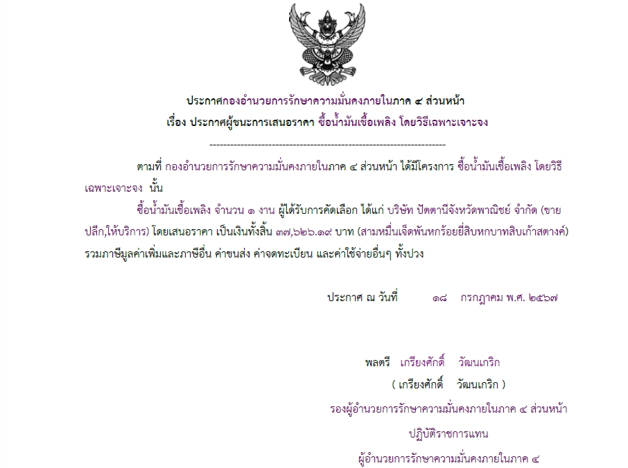 ประกาศผู้ชนะการเสนอราคา ซื้อน้ำมันเชื้อเพลิง โดยวิธีเฉพาะเจาะจง