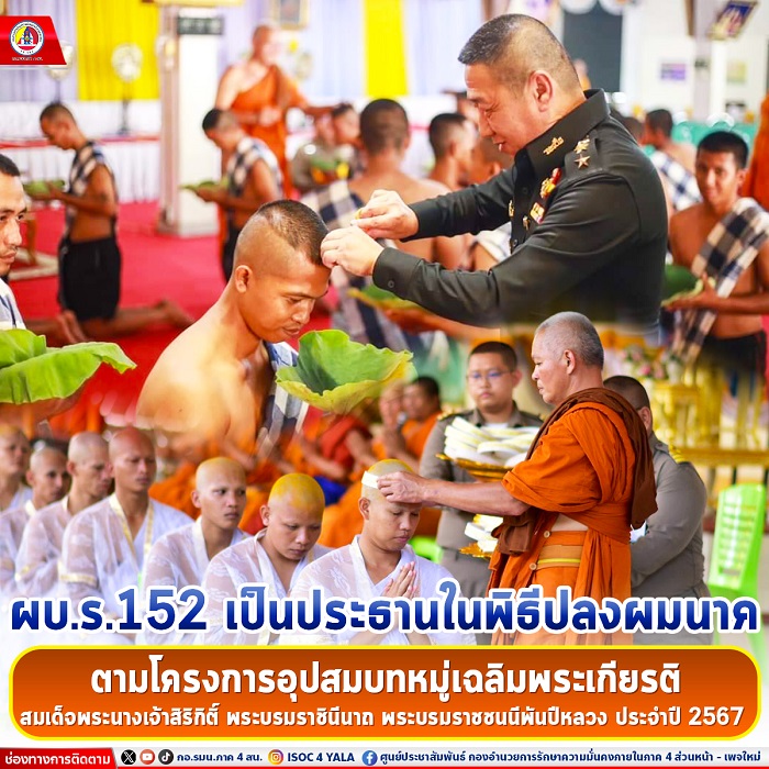 เมื่อวันที่ 18 กรกฎาคม 2567 เวลา 15.00 น. ที่ วัดเมืองยะลา พระอารามหลวง ตำบลสะเตง อำเภอเมืองยะลา จังหวัดยะลา พันเอก สิทธิศักดิ์ เจนบรรจง ผู้บังคับการกรมทหารราบที่ 152 / หัวหน้าคณะทำงานโครงการอันเนื่องมาจากพระราชดำริฯ คณะที่ 1 จังหวัดยะลา เป็นประธานฝ่ายฆราวาส ในพิธีปลงผมนาค ตามโครงการอุปสมบทหมู่เฉลิมพระเกียรติ สมเด็จพระนางเจ้าสิริกิติ์ พระบรมราชินีนาถ พระบรมราชชนนีพันปีหลวง ประจำปี 2567 โดยมี พระสิริปัญญาคุณ เจ้าคณะอำเภอยะหา-กาบัง/เจ้าอาวาสวัดเมืองยะลา พระอารามหลวง เป็นประธานฝ่ายสงฆ์ และมีข้าราชการทหาร ตำรวจ พร้อมด้วยหัวหน้าส่วนราชการ นายอำเภอ บิดา มารดา ญาติพี่น้อง และพุทธศาสนิกชนเข้าร่วมเป็นจำนวนมากท่ามกลางความปลาบปลื้มใจ