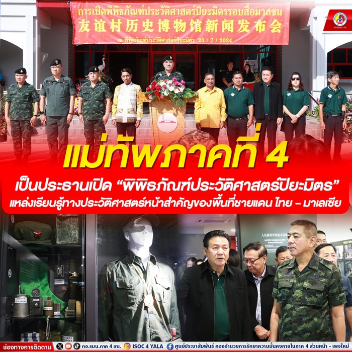 โอกาสนี้ แม่ทัพภาคที่ 4 / ผู้อำนวยการรักษาความมั่นคงภายในภาค 4 กล่าวว่า “พิพิธภัณฑ์ทางประวัติศาสตร์ปิยะมิตร คือพื้นที่ที่ให้ความสำคัญในการสืบสาน รักษา ต่อยอดข้อมูลทางประวัติศาสตร์และของใช้ของพรรคคอมมิวนิสต์มาลายาซึ่งเป็นประวัติศาสตร์หน้าสำคัญของพื้นที่ชายแดนไทย – มาเลเซีย และประเทศชาติที่ไม่สามารถจะปล่อยให้เลือนหายไปตามกาลเวลาได้ ซึ่งหลังจากการเจรจาสันติภาพไตรภาคี และมีการลงนามเพื่อยุติสถานการณ์การต่อสู้ด้วยกำลังอาวุธของพรรคคอมมิวนิสต์มาลายา เมื่อวันที่ 2 ธันวาคม 2532 สมาชิกพรรคคอมมิวนิสต์มาลายาได้เข้าร่วมเป็นผู้พัฒนาชาติไทย ซึ่งสิ่งที่ตามมาคือสมาชิกได้ร่วมกันปฏิบัติจนเห็นเป็นรูปธรรม เช่น การพัฒนาพื้นที่ป่าเขาให้เป็นแหล่งท่องเที่ยวสำคัญ ไม่ว่าจะเป็นอุโมงค์ปิยะมิตร สวนหมื่นบุปผา สวนส้มโชกุน สวนทุเรียนสายพันธุ์ต่าง ๆ และการเลี้ยงสัตว์เศรษฐกิจ เช่น ไก่เบตง ปลากือเลาะ และในธรรมชาติของที่นี่ ที่มีสายน้ำบริสุทธิ์ล้วนเกิดจากภูมิปัญญาของสมาชิกพรรคคอมมิวนิสต์มาลายาได้กลายเป็นการพัฒนาอย่างยั่งยืน สามารถสร้างคุณภาพชีวิต สร้างสังคมที่เข้มแข็ง สร้างแหล่งท่องเที่ยวจนมีชื่อเสียง เป็นแหล่งท่องเที่ยวสำคัญของประเทศ เป็นการขับเคลื่อน Soft Power อย่างแท้จริง”