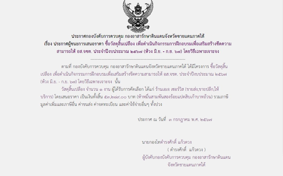 จัดซื้อ จัดจ้างประกาศผู้ชนะการเสนอราคา ประกาศผู้ชนะการเสนอราคา ซื้อวัสดุสิ้นเปลือง เพื่อคำเนินกิจกรรมการฝึกอบรมเพื่อเสริมสร้างขีดความ สามารถให้ อส.จชต. ประจำปิ๊งบประมาณ ๒๕๖๗ (ห้วง มิ.ย. – ก.ย. ๖๗) โดยวิธีเฉพาะเจาะจง July 20, 2024 354 Share Facebook Twitter Google+ Telegram LINE