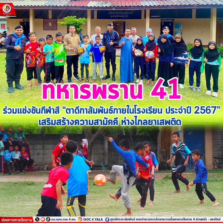 เมื่อวันที่ 20 กรกฎาคม 2567 เวลา 10.00 น. หน่วยเฉพาะกิจกรมทหารพรานที่ 41 โดย ผู้บังคับกองร้อยทหารพรานที่ 4109 พร้อมด้วยกำลังพล ชุดปฏิบัติการกิจการพลเรือน กองร้อยทหารพรานที่ 4109 ร่วมกับ ส่วนราชการที่เกี่ยวข้อง, ผู้นำท้องถิ่น, ผู้นำชุมชน, คณะครู และนักเรียน จัดกิจกรรมการแข่งขันกีฬาสี “ตาดีกาสัมพันธ์ภายในโรงเรียน ประจำปี 2567” พร้อมทั้งดูแลความปลอดภัยให้กับประชาชน ทั้งนี้ได้สนับสนุนของรางวัลให้กับนักเรียนตาดีกาที่ได้เข้าร่วมงานในครั้งนี้ โดยมี นายมะรูดิง ดอแว นายกองค์การบริหารส่วนตำบลจะกว๊ะ เป็นประธานฯ ณ สนามกีฬา โรงเรียนตาดีกาวาดีอามาน บ้านจะกว๊ะ หมู่ที่ 1 ตำบลจะกว๊ะ อำเภอรามัน จังหวัดยะลา