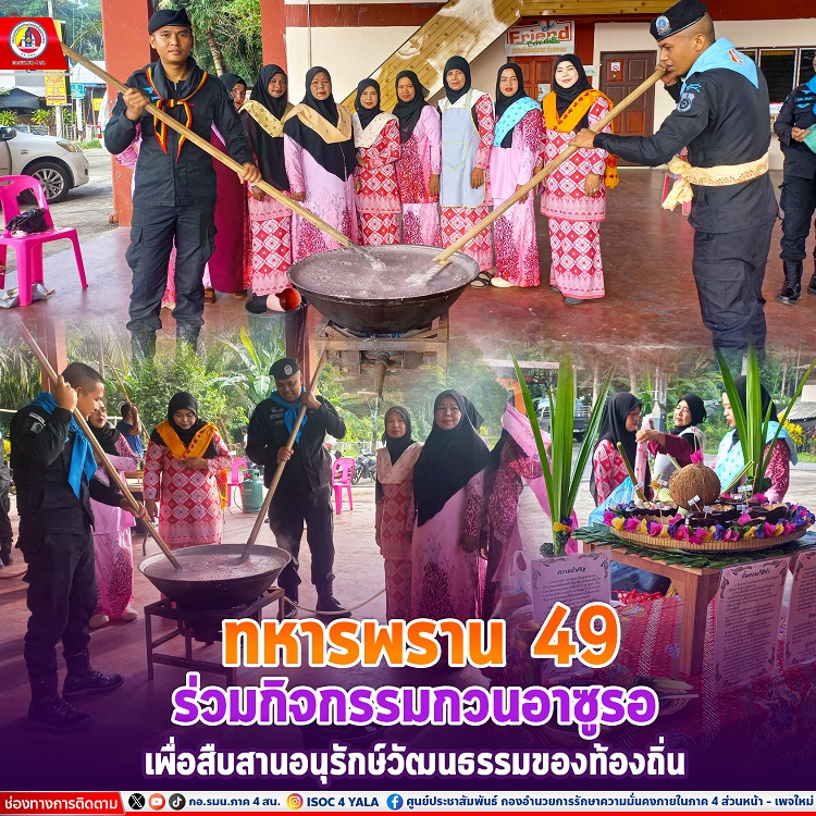 เมื่อวันที่ 24 กรกฎาคม 2567 เวลา 09.00 น. ที่ องค์การบริหารส่วนตำบลผดุงมาตร หมู่ที่ 2 บ้านบือจ๊ะ ตำบลผดุงมาตร อำเภอจะแนะ จังหวัดนราธิวาส หน่วยเฉพาะกิจกรมทหารพรานที่ 49 จัดกำลังพลกองร้อยทหารพรานที่ 4904 และชุดปฏิบัติการกิจการพลเรือน ร่วมกับ ส่วนราชการ, ผู้นำหมู่บ้าน, ผู้นำศาสนา และประชาชนในพื้นที่ ร่วมกิจกรรมกวนอาซูรอ เพื่อสืบสานอนุรักษ์วัฒนธรรมของท้องถิ่นในพื้นที่ โดยการร่วมกันทำขนมกวนอาซูรอ เสริมสร้างสังคมแห่งความร่วมมือ มีการแบ่งปันกัน และสร้างความใกล้ชิดระหว่างหน่วยงานในท้องถิ่นกับประชาชนในพื้นที่ โดยใช้มิติของวัฒนธรรมและประเพณีท้องถิ่น