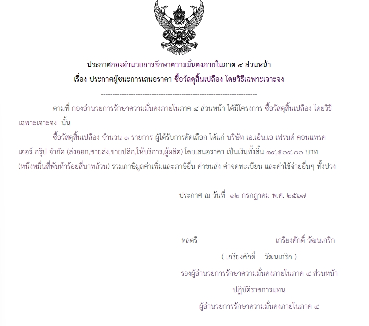 ประกาศผู้ชนะการเสนอราคา ซื้อวัสดุสิ้นเปลือง โดยวิธีเฉพาะเจาะจง