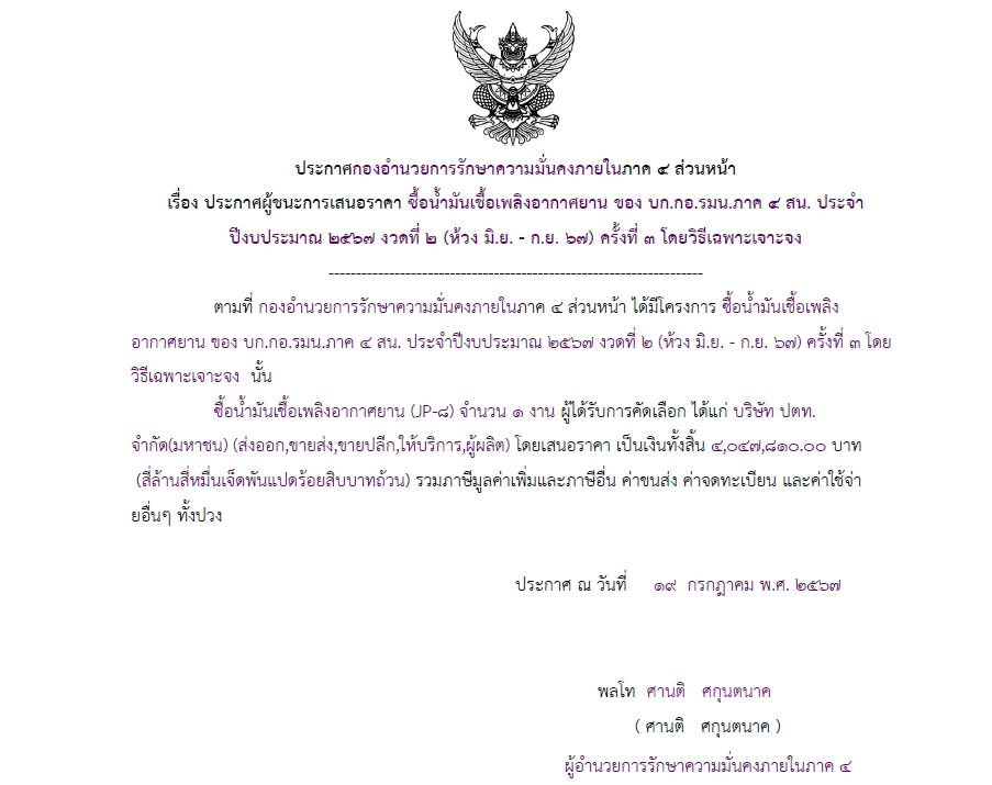 จัดซื้อ จัดจ้างประกาศผู้ชนะการเสนอราคา ประกาศผู้ชนะการเสนอราคา ซื้อน้ำมันเชื้อเพลิงอากาศยาน ของ บก.กอ.รมน.ภาค ๔ สน. ประจำปีงบประมาณ ๒๕๖๗ งวดที่ ๒ (ห้วง มิ.ย. – ก.ย. ๖๗)ครั้งที่ ๓ โดยวิธีเฉพาะเจาะจง July 25, 2024 265 Share Facebook Twitter Google+ Telegram LINE