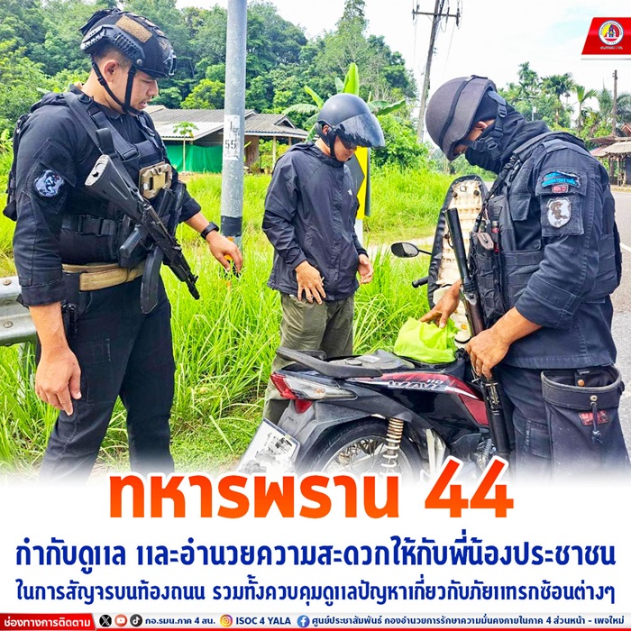 เมื่อวันที่ 25 กรกฎาคม 2567 หน่วยเฉพาะกิจกรมทหารพรานที่ 44 ดำเนินการตั้งจุดตรวจ/จุดสกัดตามแผน POP UP ของหน่วย เพื่อกำกับดูแลความปลอดภัย รวมทั้งอำนวยความสะดวกให้กับพี่น้องประชาชนในการสัญจรบนท้องถนน รวมไปถึงเพื่อเป็นการรักษาความปลอดภัยถนนเส้นทางสายหลัก และสายรอง อีกทั้งเป็นการแสดงกำลังตามแผนเชิงรุก เพื่อควบคุมดูแลป้องกัน การขนย้ายสิ่งของผิดกฎหมาย การขนย้ายสารเสพติด และการตรวจสอบบุคคลภายนอกที่เดินทางเข้ามาในพื้นที่ เพื่อให้ “พื้นที่ปลอดเหตุ ประชาชนสัญจรปลอดภัย”