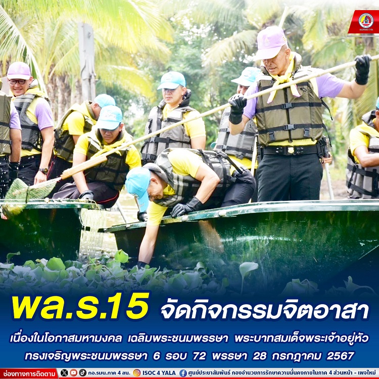 นอกจากนี้ ผู้บัญชาการกองพลทหารราบที่ 15 / ผู้อำนวยการศูนย์ประสานงานโครงการอันเนื่องมาจากพระราชดำริ ลงเรือนำกำลังจิตอาสา ร่วมพัฒนาความสะอาด กำจัดผักตบชวา ปรับปรุงภูมิทัศน์บริเวณพื้นที่ภายในหน่วย เพื่อส่งเสริมให้ข้าราชการ และประชาชน มีจิตสาธารณะ รู้รักสามัคคี ร่วมกันบำเพ็ญสาธารณประโยชน์เพื่อสังคม และเพื่อเป็นการเฉลิมพระเกียรติ พระบาทสมเด็จพระเจ้าอยู่หัวฯ เนื่องในโอกาสมหามงคล เฉลิมพระชนมพรรษา พระบาทสมเด็จพระเจ้าอยู่หัว ทรงเจริญพระชนมพรรษา 6 รอบ 72 พรรษา ในวันที่ 28 กรกฎาคม 2567