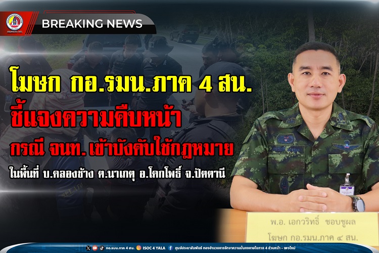 ทั้งนี้ยังคงมีสื่อสังคมออนไลน์ เพจแนวร่วม (Fake News) ต่างๆ พยายามออกมาบิดเบือน กล่าวหาโจมตีว่าเจ้าหน้าที่กระทำเกินกว่าเหตุและทำให้ชาวบ้านได้รับผลกระทบจากการปฏิบัติ รวมถึงบิดเบือนว่าเจ้าหน้าที่ได้วิสามัญผู้ก่อเหตุรุนแรงเสียชีวิตแล้ว เพื่อเป็นการปลุกปั่นทำลายขวัญ และมีเจตนาทำให้สังคมเกิดความสับสน กองอำนวยการรักษาความมั่นคงภายในภาค 4 ส่วนหน้า ขอชี้แจงว่าข้อมูลดังกล่าวข้างต้นไม่เป็นความจริงแต่อย่างใด จึงขอให้พี่น้องประชาชนโปรดใช้วิจารณญาณในการเปิดรับข้อมูลข่าวสารอย่างรอบด้าน ตรวจสอบข้อเท็จจริงก่อนที่จะเชื่อ หรือส่งต่อข้อมูลดังกล่าวออกไป เพื่อไม่ให้ตกเป็นเหยื่อของขบวนการที่มุ่งทำลายความเชื่อมั่นต่อเจ้าหน้าที่รัฐ ซึ่งอาจส่งผลกระทบต่อสังคมโดยรวม รวมถึงจะมีความผิดทางกฎหมาย ตามพระราชบัญญัติว่าด้วยการกระทำความผิดเกี่ยวกับคอมพิวเตอร์ อีกด้วย หากมีข้อสงสัยสามารถติดตามข้อมูลข่าวสารข้อเท็จจริงได้ทางเพจ Facebook ศูนย์ประชาสัมพันธ์ กองอำนวยการรักษาความมั่นคงภายในภาค 4 ส่วนหน้า – เพจใหม่