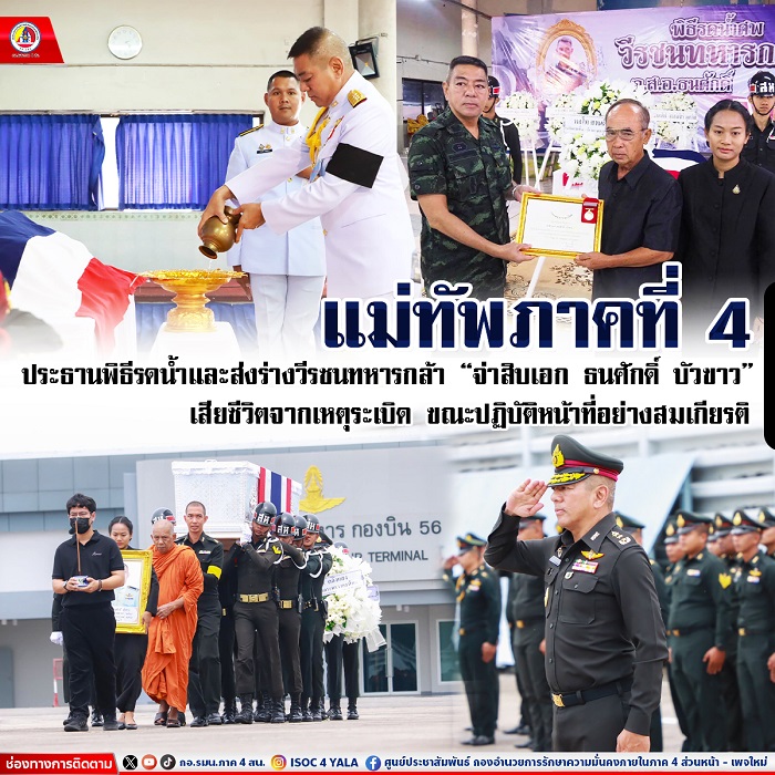 วันนี้ ( 29 กรกฎาคม 2567 ) เวลา 08.30 น. ที่ วัดหงษ์ประดิษฐาราม (วัดคอหงส์) ตำบลคอหงส์ อำเภอหาดใหญ่ จังหวัดสงขลา พลโท ศานติ ศกุนตนาค แม่ทัพภาคที่ 4/ ผู้อำนวยการรักษาความมั่นคงภายในภาค 4 เป็นประธานพิธีรดน้ำผู้วายชนม์ และส่งร่างวีรชนทหารกล้า จ่าสิบเอก ธนศักดิ์ บัวขาว ตำแหน่ง นายสิบการข่าว ชุดปฏิบัติการรบพิเศษ กองร้อยรบพิเศษ กองพันรบพิเศษที่ 1 กรมรบพิเศษที่ 4 อายุ 39 ปี เสียชีวิตจากการปฏิบัติหน้าที่ร่วมกับหน่วยปฏิบัติการพิเศษร่วมประจำจังหวัดปัตตานี เข้าสนธิกำลัง 3 ฝ่าย ในสถานการณ์กรณีบังคับใช้กฎหมาย หลังเกิดเหตุผู้ก่อเหตุรุนแรงพยายามหลบหนีด้วยการขว้างระเบิดและเปิดฉากการยิงใส่เจ้าหน้าที่ ณ บ้านคลองช้าง ตำบลนาเกตุ อำเภอโคกโพธิ์ จังหวัดปัตตานี เมื่อวันที่ 27 กรกฎาคม 2567 ที่ผ่านมา