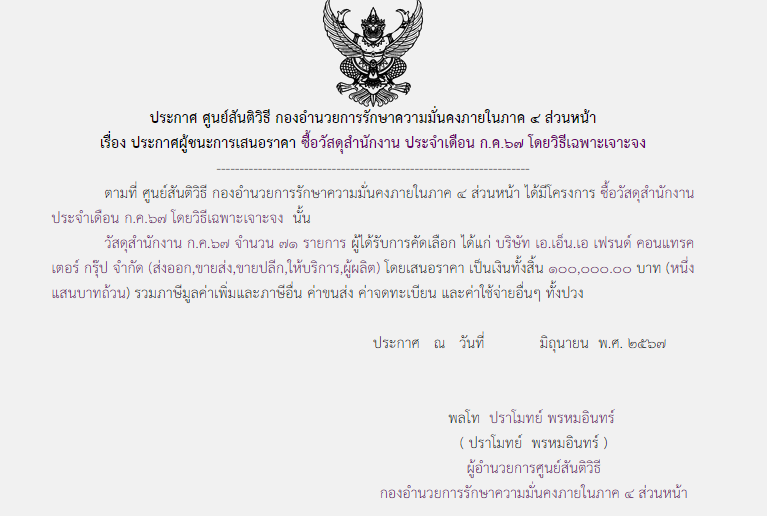ประกาศผู้ชนะการเสนอราคา ซื้อวัสดุสำนักงาน ประจำเดือน ก.ค.๖๗ โดยวิธีเฉพาะเจาะจง