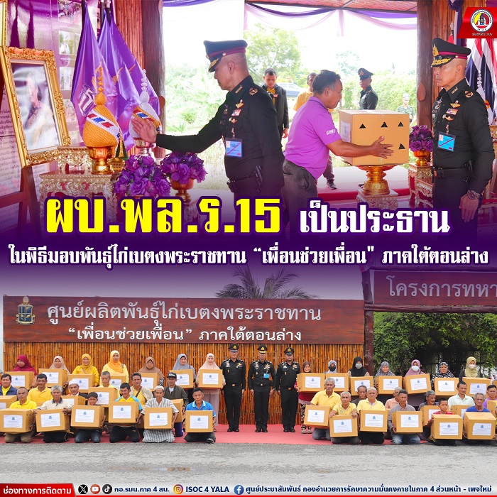 วันนี้ (29 กรกฎาคม 2567) เวลา 10.30 น. ณ โครงการทหารพันธุ์ดี กองพันทหารช่างที่ 15 กองพลทหารราบที่ 15 ค่ายสมเด็จพระสุริโยทัย ตำบลบ่อทอง อำเภอหนองจิก จังหวัดปัตตานี พลตรี เฉลิมพร ขำเขียว ผู้บัญชาการกองพลทหารราบที่ 15 เป็นประธานในพิธีมอบพันธุ์ไก่เบตงพระราชทานแก่ตัวแทนหน้าพระบรมฉายาลักษณ์ สมเด็จพระกนิษฐาธิราชเจ้า กรมสมเด็จพระเทพรัตนราชสุดา ฯ สยามบรมราชกุมารี ที่ได้ทรงพระราชทานพระราชานุมัติพันธุ์ไก่เบตง ที่ผลิตจากศูนย์ผลิตพันธุ์ไก่เบตงพระราชทาน “เพื่อนช่วยเพื่อน” ภาคใต้ตอนล่างรวม 397 ครอบครัว จำนวน 1,895 ตัว ให้แก่ประชาชนในพื้นที่จังหวัดปัตตานี จังหวัดยะลา จังหวัดนราธิวาส จังหวัดพัทลุง และจังหวัดสงขลา โดยมี พันโท ศุภฤกษ์ ชื่นจิต ผู้บังคับกองพันทหารช่างที่ 15 กองพลทหารราบที่ 15, ตัวแทนประชาชนผู้รับมอบ ตลอดจนกำลังพลกองพันทหารช่างที่ 15 กองพลทหารราบที่ 15 ร่วมให้การต้อนรับ