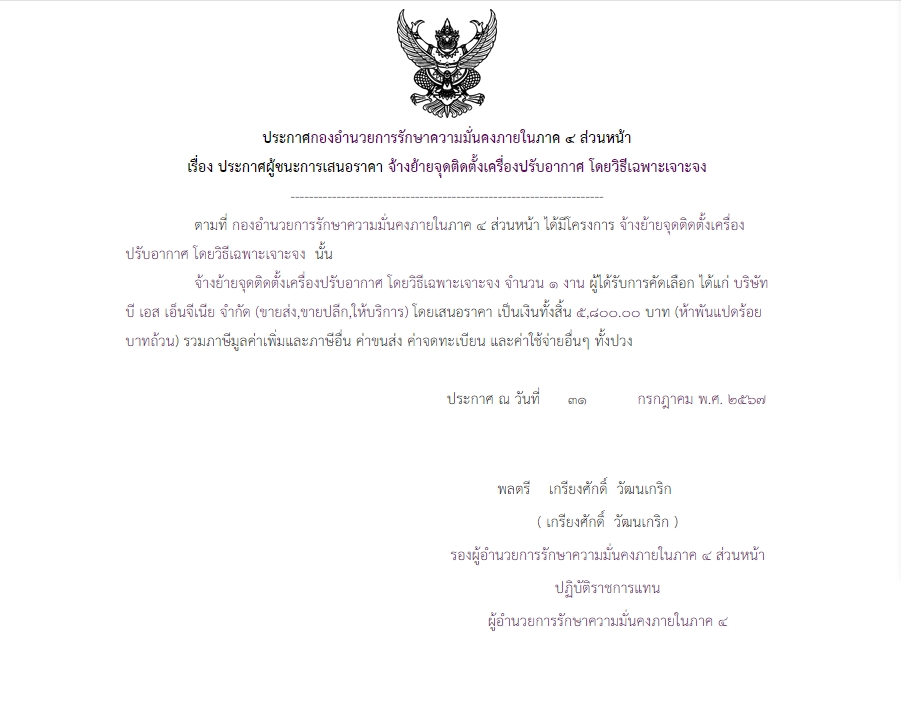 ประกาศผู้ชนะการเสนอราคา จ้างย้ายจุดติดตั้งเครื่องปรับอากาศ โดยวิธีเฉพาะเจาะจง