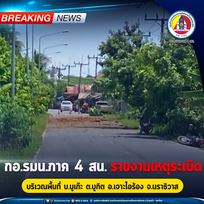วันนี้ 31 กรกฏาคม 2567 เวลาประมาณ 11.10 น. ได้เกิดเหตุระเบิดเส้นทาง ขณะที่เจ้าหน้าที่ตำรวจชุดสืบสวน สถานีตำรวจภูธรเจาะไอร้อง จำนวน 8 นาย เดินทางด้วยรถยนต์กระบะจำนวน 2 คัน ในบริเวณใกล้สะพาน พื้นที่ บ้านบูเก๊ะ หมู่ที่ 2 ตำบลบูกิต อำเภอเจาะไอร้อง จังหวัดนราธิวาส จำนวน 1 ลูก และต่อมาในเวลาใกล้เคียงกัน ได้เกิดระเบิดขึ้นอีก 1 ลูก ห่างจากจุดแรกประมาณ 50 เมตร เบื้องต้นเจ้าหน้าที่ปลอดภัย และมีชาวบ้านได้รับบาดเจ็บ 1 คน ทราบชื่อ นายนรูดิน ดอเล๊าะ มีแผลที่หัวเข่าด้านซ้ายเล็กน้อย