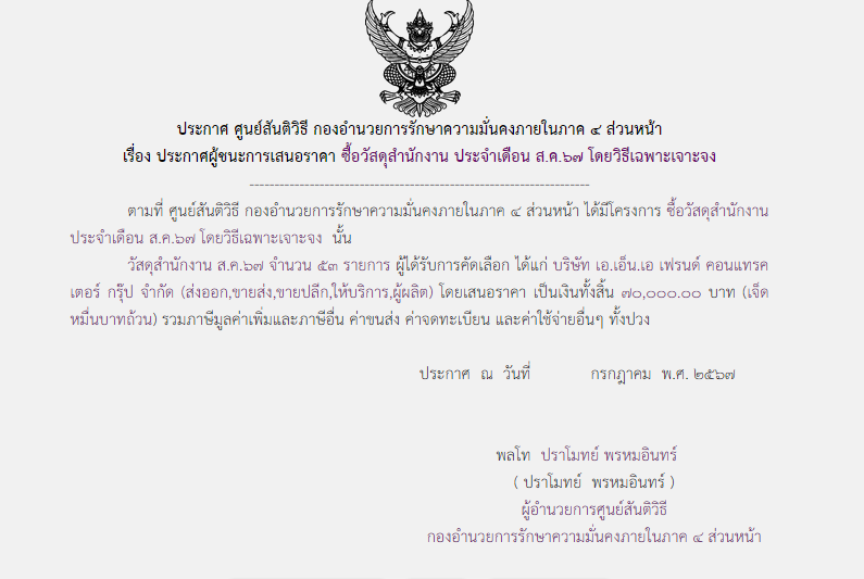 ประกาศผู้ชนะการเสนอราคา ซื้อวัสดุสำนักงาน ประจำเดือน ส.ค.๖๗ โดยวิธีเฉพาะเจาะจง