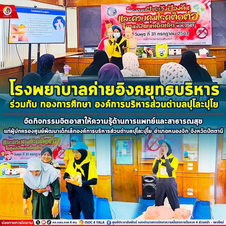 วันที่ 31 กรกฎาคม 2567 09.00 – 12.00 น. แผนกส่งเสริมสุขภาพ และเวชกรรมป้องกันโรงพยาบาลค่ายอิงคยุทธบริหาร ร่วมกับ กองการศึกษา องค์การบริหารส่วนตำบลปุโละปุโย จัดกิจกรรม จิตอาสาให้ความรู้ด้านการแพทย์และสาธารณสุข ใน ”โครงการเฝ้าระวังป้องกันและควบคุมโรคติดต่อในศูนย์พัฒนาเด็กเล็ก“ ให้ผู้ปกครองศูนย์พัฒนาเด็กเล็กได้เข้ามีส่วนร่วมในกิจกรรม ประกอบด้วย ให้ความรู้และการป้องกันเกี่ยวกับโรคติดต่อ ,กิจกรรมการปฐมพยาบาลการช่วยชีวิตขั้นพื้นฐาน( CPR) และการใช้เครื่องกระตุกหัวใจอัตโนมัติ (AED) ,กิจกรรมสอนการช่วยชีวิตและปฐมพยาบาลสำหรับคนจมน้ำและงูกัด, กิจกรรมช่วยชีวิตกรณีมีอาหารติดคอ และการดูแลสุขภาพช่องปากและฟัน มีผู้ปกครองเข้าร่วมกิจกรรม จำนวน 30 คน โดยมี นายซานูซี วงศ์ปัตน นายกองค์การบริหารส่วนตำบลปุโละปุโย กล่าวเปิดพิธี นายอารีดี ปากบารา ปลัดองค์การบริหารส่วนตำบลปุโละปุโย และเจ้าหน้าที่กองการศึกษาองค์การบริหารส่วนตำบลปุโละปุโย อำเภอหนองจิก จังหวัดปัตตานี ให้การต้อนรับ ทั้งนี้ผู้ปกครองศูนย์พัฒนาเด็กเล็กได้รับความรู้และความสนุกสนาน อย่างมากมาย