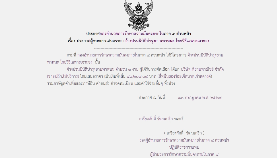 ประกาศผู้ชนะการเสนอราคา จ้างปรนนิบัติบำรุงยานพาหนะ โดยวิธีเฉพาะเจาะจง