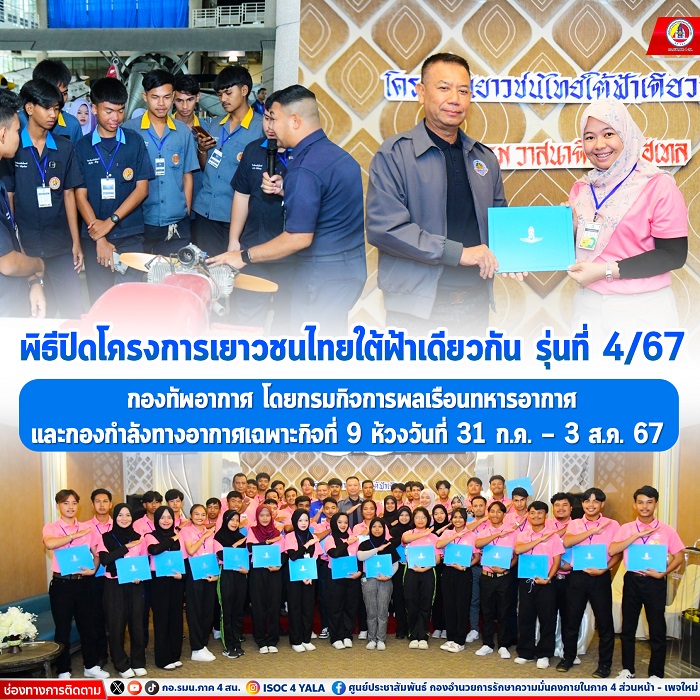วันที่ 31 กรกฎาคม 2567 เวลา 08.30 น. ที่กองกําลังทางอากาศเฉพาะกิจที่ 9 สนามบินบ่อทอง จังหวัดปัตตานี คณะเยาวชนจากโครงการเยาวชนไทยใต้ฟ้าเดียวกัน ในพื้นที่จังหวัดชายแดนภาคใต้ได้เดินทางไปท่าอากาศยานทหาร 2 กองบิน 6 แขวงสนามบิน เขตดอนเมือง กรุงเทพมหานคร เพื่อเข้าร่วมโครงการเยาวชนไทยใต้ฟ้าเดียวกัน รุ่นที่ 4/67 และได้เข้าเยี่ยมชมพร้อมรับฟังบรรยายการสรุป ณ พิพิธภัณฑ์ทหารอากาศและการบินแห่งชาติ โดยมี พลอากาศโท ประภาส สอนใจดี เจ้ากรมกิจการพลเรือนทหารอากาศ พร้อมทั้งเจ้าหน้าที่กรมกิจการพลเรือนทหารอากาศ ร่วมให้การต้อนรับ