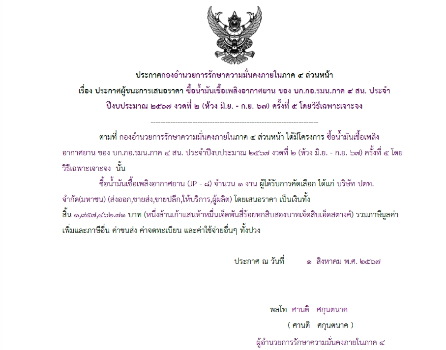 จัดซื้อ จัดจ้างประกาศผู้ชนะการเสนอราคา ประกาศผู้ขนะการเสนอราคา ซื้อน้ำมันเชื้อเพลิงอากาศยาน ของ บก.กอ.รมน.ภาค ๔ สน. ประจำ ปีงบประมาณ ๒๕๖๗ งวดที่ ๒ (ห้วง มิ.ย. – ก.ย. ๖๗) ครั้งที่ ๕ โดยวิธีเฉพาะเจาะจง August 3, 2024 299 Share Facebook Twitter Google+ Telegram LINE