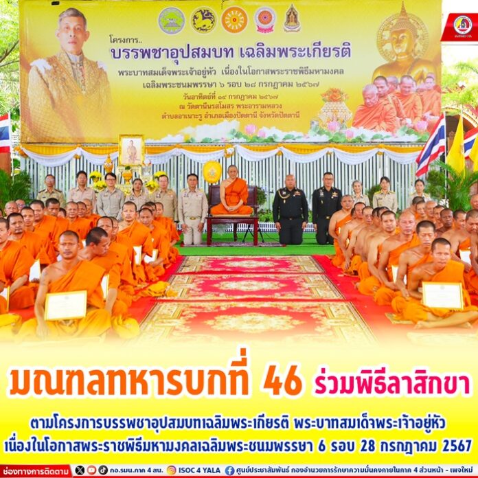 เมื่อวันที่ 3 สิงหาคม 2567 เวลา 14.00 น. ที่ วัดตานีนรสโมสร พระอารามหลวง อำเภอเมือง จังหวัดปัตตานี พันเอก ณัฏฐ์พัชร์ สทิสินทร์ หัวหน้ากองกำลังพล มณฑลทหารบกที่ 46 เป็นผู้แทนผู้บัญชาการมณฑลทหารบกที่ 46 ร่วมในพิธีมอบเกียรติบัตร และพิธีลาสิกขา แด่พระภิกษุสงฆ์ที่อุปสมบท ตามโครงการบรรพชาอุปสมบทเฉลิมพระเกียรติพระบาทสมเด็จพระเจ้าอยู่หัว เนื่องในโอกาสพระราชพิธีมหามงคลเฉลิมพระชนมพรรษา 6 รอบ 28 กรกฎาคม 2567 ตั้งแต่วันที่ 15 กรกฎาคม ถึง 2 สิงหาคม 2567 เพื่อให้พุทธศาสนิกชน ได้มีส่วนร่วมบำเพ็ญกุศล เพื่อเฉลิมพระเกียรติฯ และถวายเป็นพระราชกุศลแด่พระบาทสมเด็จพระเจ้าอยู่หัว และได้มีโอกาสปฏิบัติตามหลักธรรมของพระพุทธศาสนา โดยมี นายชัยพร นิยมแก้ว รองผู้ว่าราชการจังหวัดปัตตานี เป็นประธานในพิธี มีหัวหน้าส่วนราชการ หัวหน้าหน่วยงานรัฐวิสาหกิจ ข้าราชการ ทหาร ตำรวจ พนักงาน เจ้าหน้าที่ และพุทธศาสนิกชน เข้าร่วมพิธี