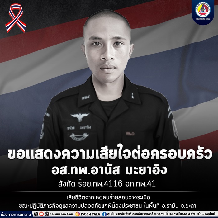 กองอำนวยการรักษาความมั่นคงภายในภาค 4 ส่วนหน้า ขอแสดงความเสียใจกับครอบครัว อาสาสมัครทหารพราน อานัส มะยาอิง สังกัด กองร้อยทหารพรานที่ 4116 หน่วยเฉพาะกิจกรมทหารพรานที่ 41 เสียชีวิตจากเหตุคนร้ายลอบวางระเบิด ขณะปฏิบัติภารกิจดูแลความปลอดภัยแก่พี่น้องประชาชน ในพื้นที่ อำเภอรามัน จังหวัดยะลา เมื่อช่วงเช้าวันนี้ (4 สิงหาคม 2567)