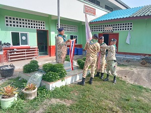 หน่วยเฉพาะกิจสันติสุข โดย ชุดสันติสุขที่ 304 ดำเนินการฝึกเสริมสร้างผู้นำสมาชิกกองอาสารักษาดินแดนจังหวัดชายแดนภาคใต้ รุ่นที่ 11 อำเภอกาบัง ฝึกการปฏิบัติในสถานศึกษา โดยดำเนินกิจกรรมเสาธง 5 นาที เพื่อเสริมสร้างความเข้าใจกับผู้นำศาสนา/บุคลากรครู และนักเรียน พร้อมทั้งเสริมสร้างการรับรู้และจดจำเกี่ยวกับประวัติความเป็นมาของธงชาติไทย ซึ่งเป็นการแสดงออกถึงการอยู่ร่วมกันภายใต้สังคมพหุวัฒนธรรมอันหลากหลายในพื้นที่จังหวัดชายแดนภาคใต้ ณ ศูนย์การศึกษาอิสลามประจำมัสยิด (ตาดีกา) นูกามีละห์ บ้านบันนังดามา หมู่ที่ 1 และ ศูนย์การศึกษาอิสลามประจำมัสยิด (ตาดีกา) อัลคอยรียะห์ บ้านนิบง หมู่ที่ 2 ตำบลกาบัง อำเภอกาบัง จังหวัดยะลา