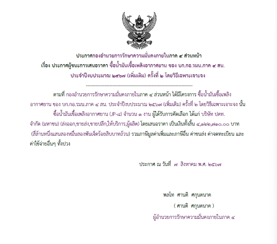 จัดซื้อ จัดจ้างประกาศผู้ชนะการเสนอราคา ประกาศผู้ชนะการเสนอราคา ซื้อน้ำมันเชื้อเพลิงอากาศยาน ของ บก.กอ.รมน.ภาค ๔ สน. ประจำปีงบประมาณ ๒๕๖๗ (เพิ่มเติม) ครั้งที่ ๒ โดยวิธีเฉพาะเจาะจง August 7, 2024 280 Share Facebook Twitter Google+ Telegram LINE