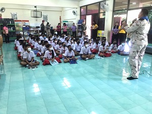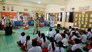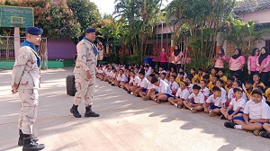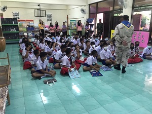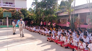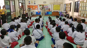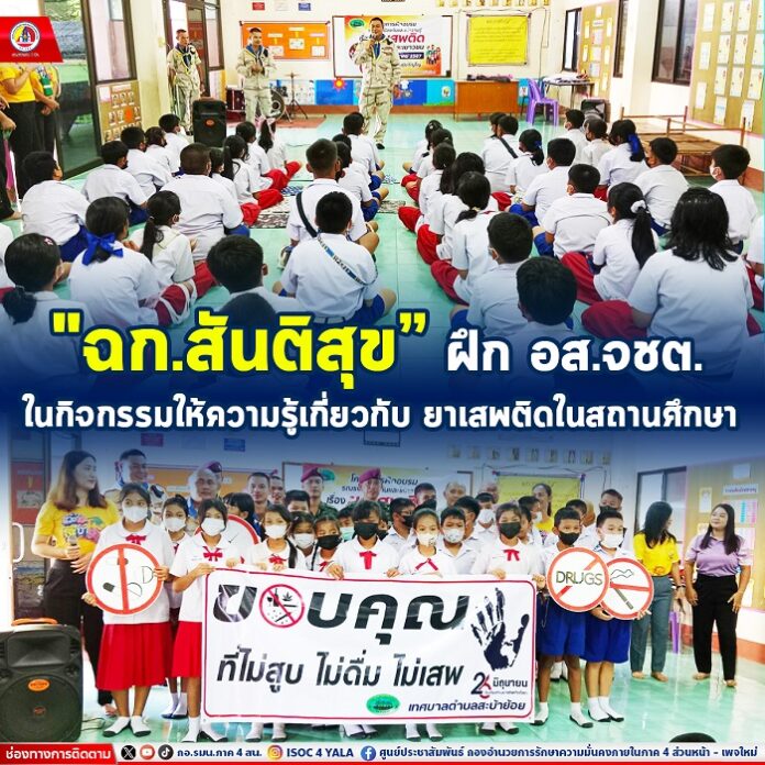 หน่วยเฉพาะกิจสันติสุข โดย ชุดสันติสุขที่ 504 ร่วมกับ ชุดทักษิณสัมพันธ์ที่ 551 และ ผู้เข้ารับมาฝึกเสริมสร้าง ผู้นำสมาชิกกองอาสารักษาดินแดน จังหวัดชายแดนใต้ อ.สะบ้าย้อย รุ่นที่ 11 ดำเนินกิจกรรมให้ความรู้เกี่ยวกับ ยาเสพติด ให้กับนักเรียนชั้นประถมศึกษาปีที่ 5 – 6 เพื่อสร้างภูมิคุ้มกันด้านยาเสพติดและให้ความรู้ ความเข้าใจเกี่ยวกับโทษและพิษภัยของยาเสพติด ณ โรงเรียนรุ่งภิณโญ หมู่ที่ 1 ตำบลสะบ้าย้อย อำเภอสะบ้าย้อย จังหวัดสงขลา