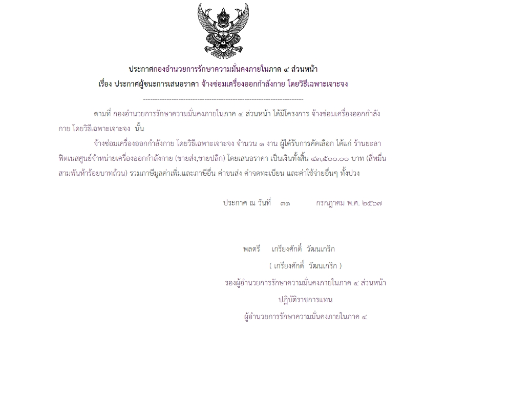 ประกาศผู้ชนะการเสนอราคา จ้างซ่อมเครื่องออกกำลังกาย โดยวิธีเฉพาะเจาะจง