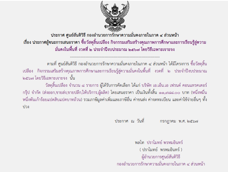 จัดซื้อ จัดจ้างประกาศผู้ชนะการเสนอราคา ประกาศผู้ชนะการเสนอราคา ซื้อวัสดุสิ้นเปลือง กิจกรรมเสริมสร้างคุณภาพการศึกษาและการเรียนรู้สู่ความ มั่นคงในพื้นที่ งวดที่ ๒ ประจำปีงบประมาณ ๒๕๖๗ โดยวิธีเฉพาะเจาะจง August 8, 2024 260 Share Facebook Twitter Google+ Telegram LINE