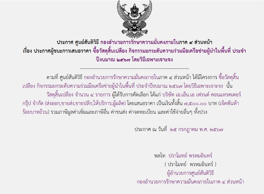 จัดซื้อ จัดจ้างประกาศผู้ชนะการเสนอราคา ประกาศผู้ชนะการเสนอราคา ซื้อวัสดุสิ้นเปลือง กิจกรรมยกระดับความร่วมมือเครือข่ายผู้นำในพื้นพื้นที่ ประจำ ปีงบมาณ ๒๕๖๗ โดยวิธีเฉพาะเจาะจง August 8, 2024 234 Share Facebook Twitter Google+ Telegram LINE