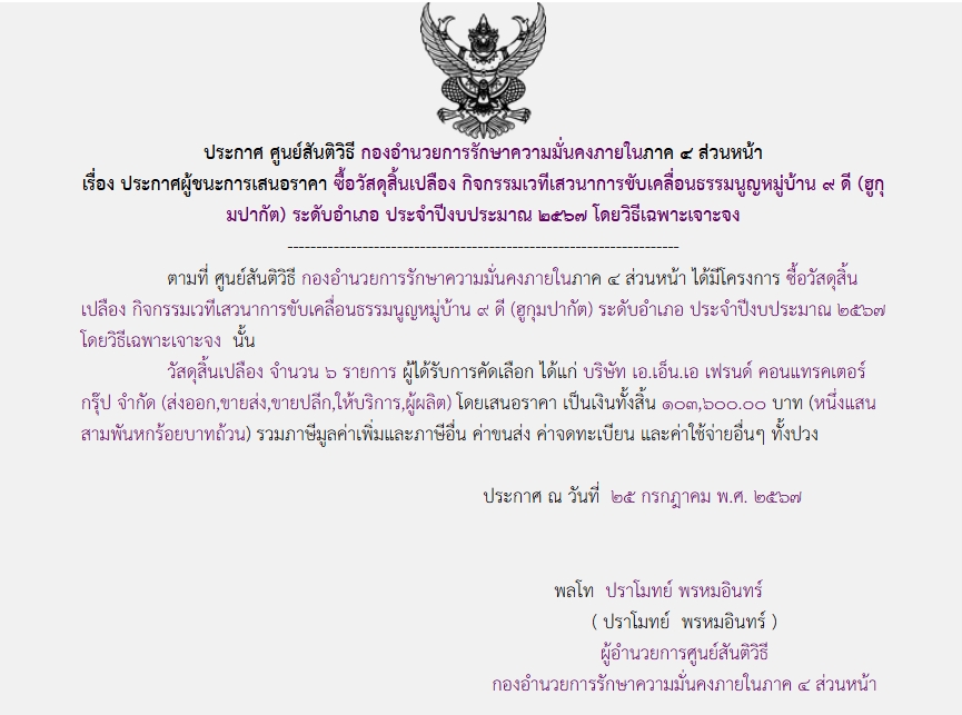 จัดซื้อ จัดจ้างประกาศผู้ชนะการเสนอราคา ประกาศผู้ขนะการเสนอราคา ซื้อวัสดุสิ้นเปลือง กิจกรรมเวทีเสวนาการขับเคลื่อนธรรมนูญหมู่บ้าน ๙ ดี (ฮูกุ มปากัต) ระดับอำเภอ ประจำปีงบประมาณ ๒๕๖๗ โดยวิธีเฉพาะเจาะจง August 8, 2024 340 Share Facebook Twitter Google+ Telegram LINE