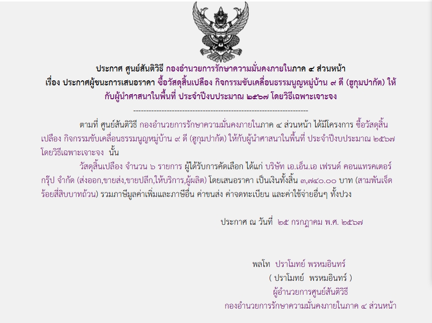 จัดซื้อ จัดจ้างประกาศผู้ชนะการเสนอราคา ประกาศผู้ชนะการเสนอราคา ซื้อวัสดุสิ้นเปลือง กิจกรรมขับเคลื่อนธรรมนูญหมู่บ้าน ๙ ดี (ฮูกุมปากัต) ให้ กับผู้นำศาสมาในพื้นที่ ประจำปีงประมาณาณ ๒๕๖๗ โดยวิธีเฉพาะเจาะจง August 8, 2024 249 Share Facebook Twitter Google+ Telegram LINE
