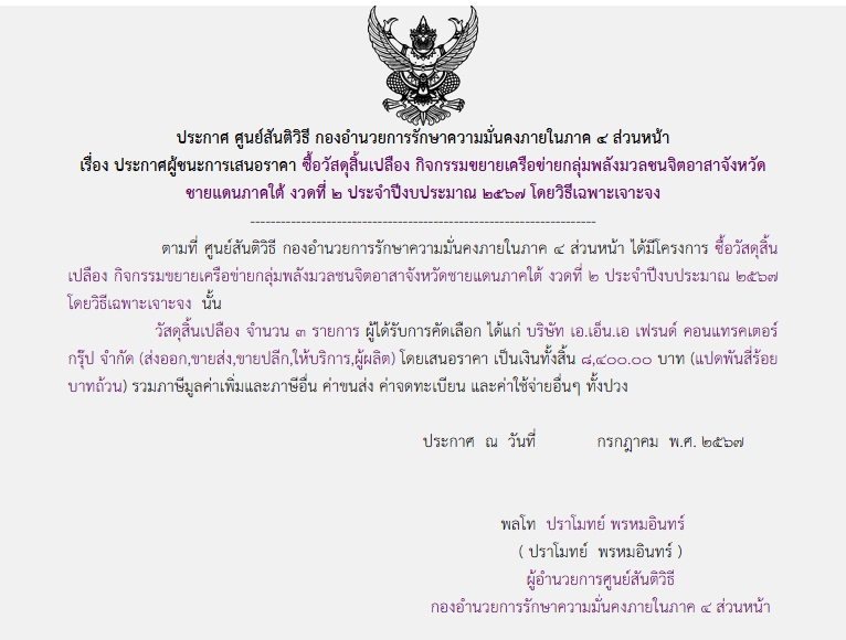 จัดซื้อ จัดจ้างประกาศผู้ชนะการเสนอราคา ประกาศผู้ชนะการเสนอราคา ซื้อวัสดุสิ้นเปลือง กิจกรรมขยายเครือข่ายกลุ่มพลังมวลชนจิตอาสาจังหวัด ชายแดนภาคใต้ งวดที่ ๒ ประจำปีงบประมาณ ๒๕๖๗ โดยวิธีเฉพาะเจาะจง August 8, 2024 359 Share Facebook Twitter Google+ Telegram LINE