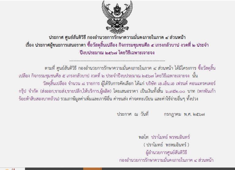 จัดซื้อ จัดจ้างประกาศผู้ชนะการเสนอราคา ประกาศผู้ชนะการเสนอราคา ซื้อวัสดสิ้นเปลือง กิจกรรมขุมขนศีล ๕ เกรงกลัวบาป งวดที่ ๒ ประจำ ปีงบประมาณ ๒๕๖๗ โดยวิธีเฉพาะเจาะจง August 8, 2024 405 Share Facebook Twitter Google+ Telegram LINE