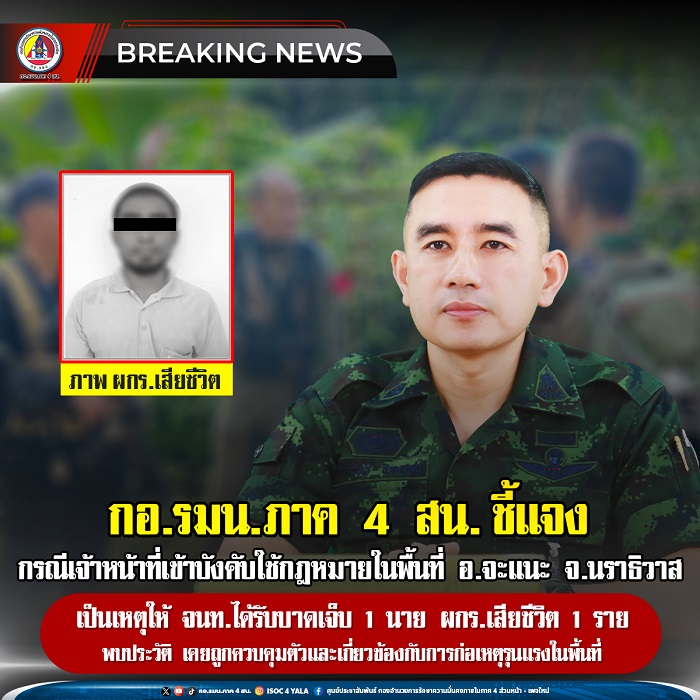 ทั้งนี้ กองอำนวยการรักษาความมั่นคงภายในภาค 4 ส่วนหน้า ขอแสดงความเสียใจกับญาติและครอบครัวของผู้เสียชีวิตจากเหตุการณ์ที่เกิดขึ้น และยังคงมีเจตนารมณ์ในการแก้ไขปัญหาตามแนวทางสันติวิธี โดยพร้อมเปิดโอกาสให้ผู้กระทำผิดเข้ามอบตัวเพื่อต่อสู้ตามกระบวนการยุติธรรม และให้พิสูจน์ความบริสุทธิ์ของตนเองตามกระบวนการของกฎหมาย รวมถึงขอความร่วมมือพี่น้องประชาชนในพื้นที่ หากผู้ใดพบเบาะแส หรือพบวัตถุต้องสงสัย รวมถึงบุคคลต้องสงสัยเข้ามาเคลื่อนไหวในพื้นที่ สามารถแจ้งได้ที่หมายเลขโทรศัพท์สายตรงแม่ทัพภาคที่ 4 / ผู้อำนวยการรักษาความมั่นคงภายในภาค 4 โทร 061-1732999 หรือเบอร์สายด่วน กอ.รมน.ภาค 4 สน. 1341 และหน่วยเฉพาะกิจในพื้นที่ได้ตลอด 24 ชั่วโมง รวมทั้งขอเรียนให้ทราบว่าผู้ให้การสนับสนุนผู้กระทำผิดด้วยวิธีการต่าง ๆ เช่น การนำพาซ่อนเร้น การให้การสนับสนุนที่พักพิง หรือการสนับสนุนเสบียงอาหาร จะมีความผิดตามประมวลกฎหมายอาญา มาตรา 189 ต้องระวางโทษจำคุกไม่เกิน 2 ปี หรือปรับไม่เกิน 40,000 บาท หรือทั้งจำทั้งปรับ