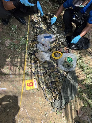 ในเวลาต่อมา เจ้าหน้าที่ชุดพิสูจน์หลักฐานฯ เข้าตรวจสอบพื้นที่เกิดเหตุ จากการตรวจสอบพบวัตถุพยาน ประกอบด้วย 1. ปืนลูกซอง จำนวน 1 กระบอก พร้อมเครื่องกระสุน, 2. ระเบิดแสวงเครื่องแบบไปป์บอมบ์ จำนวน 1 ลูก, 3. โทรศัพท์มือถือ จำนวน 2 เครื่อง และ 4. กระเป๋าพร้อมอุปกรณ์ยังชีพจำนวนหนึ่ง จึงได้รวบรวมวัตถุพยานหลักฐานต่าง ๆ เพื่อขยายผลหาความเชื่อมโยงติดตามตัวคนร้ายมาดำเนินคดีตามกฎหมายโดยเร็วที่สุด