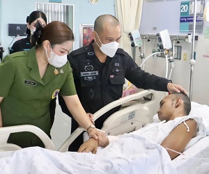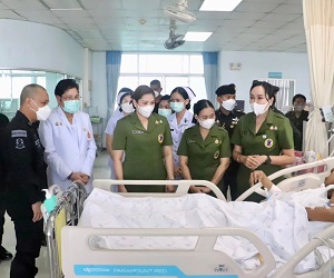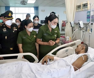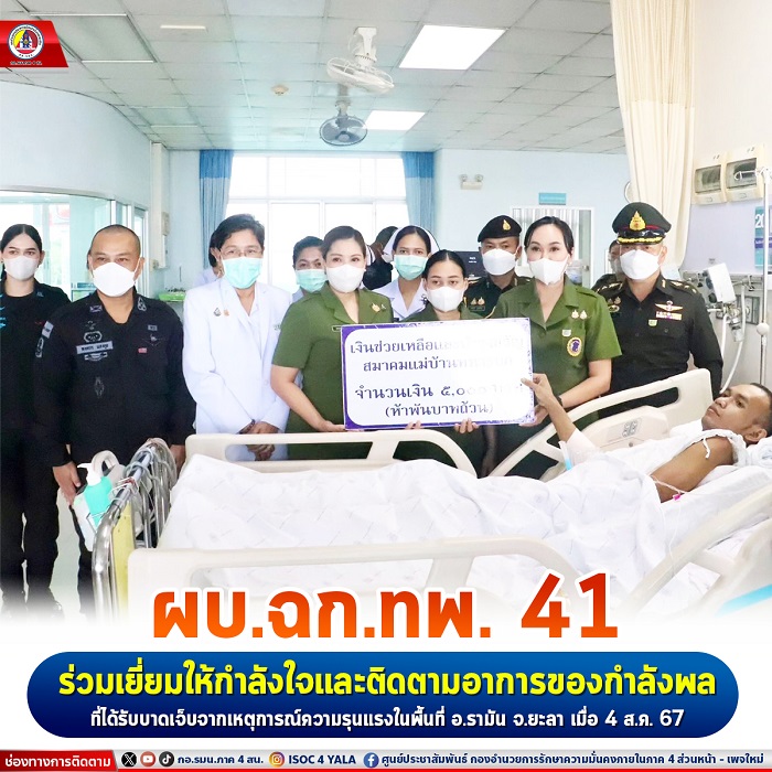 ทั้งนี้ ผู้แทน ประธานสมาคมแม่บ้านทหารบก สาขา กองทัพภาคที่ 4 ได้พูดคุยเพื่อสอบถามอาการบาดเจ็บ และขอให้มีขวัญและกำลังใจที่ดีกลับมาปฏิบัติงานได้อย่างมีประสิทธิภาพในเร็ววัน และขอขอบคุณในความทุ่มเทเสียสละ เพื่อดูแลความปลอดภัยให้กับพี่น้องประชาชน รวมทั้งได้สอบถามปัญหาข้อขัดข้องต่าง ๆ เพื่อให้ทางหน่วยเฉพาะกิจกรมทหารพรานที่ 41 จะได้ดำเนินการช่วยเหลือตามความต้องการ อีกทั้งยังได้มอบของอุปโภคบริโภค เพื่อสร้างขวัญและกำลังใจที่ดีต่อกำลังพลที่พักรักษาตัวและครอบครัว