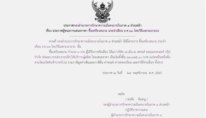 ประกาศผู้ชนะการเสนอราคา ซื้อเสบียงสนาม ประจำเดือน ธ.ค.๖๓ โดยวิธีเฉพาะเจาะจง (81,375.00)